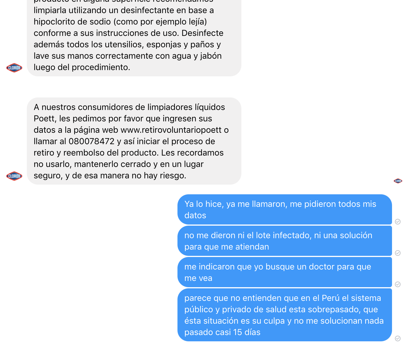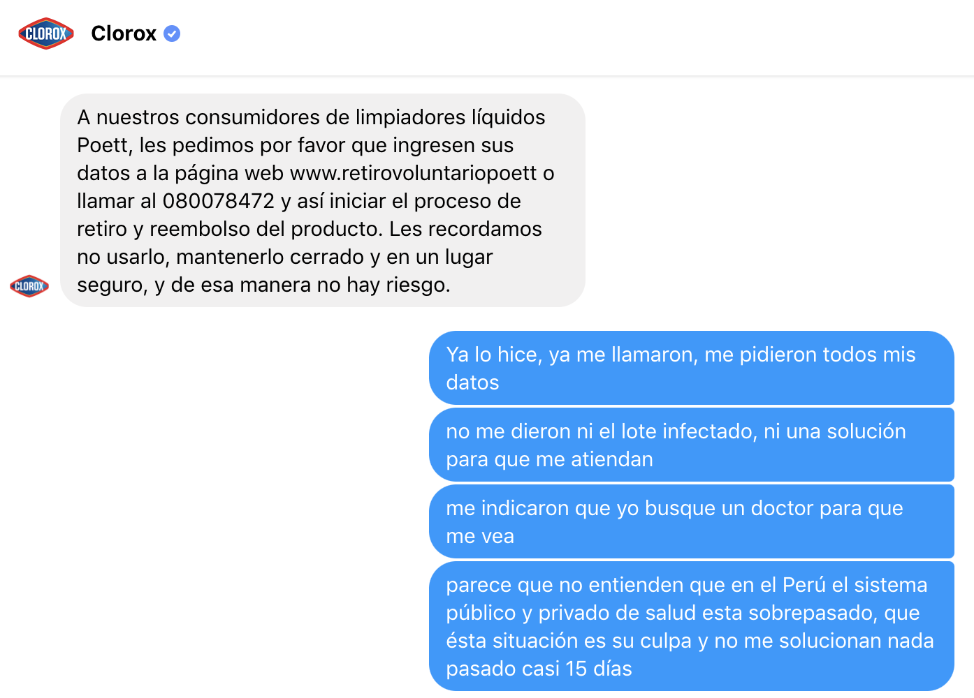 A la par de ver este video (que ya le respondí) empiezan a entrar las respuestas de Clorox (la dueña de Poett) al inbox de Messenger. Lejos de evolucionar en mensaje, continúan siendo las mismas respuestas (sin solución) que recibí hace unos días vía una llamada por teléfono desde Estados Unidos. Pero vayamos en orden en esta mazamorra.