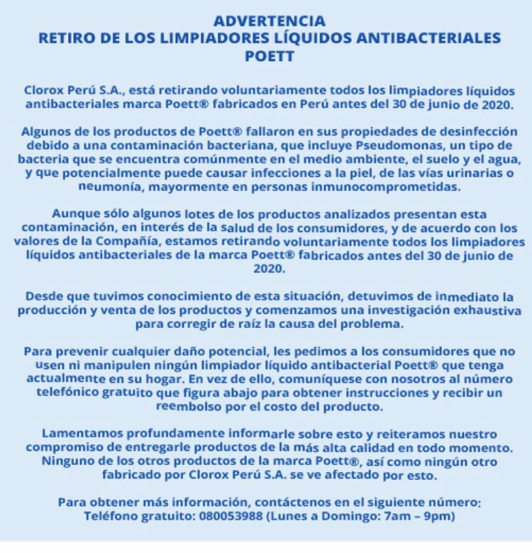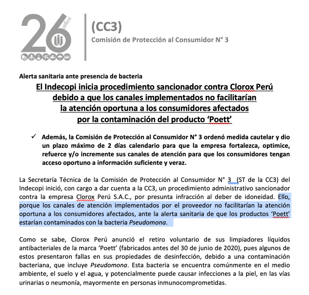 DOS. No nos informaron correctamente ni prontamente. Doce días después de la paralización de los lotes y el anuncio por los escasos canales que la empresa consideró, la Secretaría Técnica de la Comisión de Protección al Consumidor N° 3 (ST de la CC3) del Indecopi inició, con cargo a dar cuenta a la CC3, un procedimiento administrativo sancionador contra la empresa Clorox Perú, por presunta infracción al deber de idoneidad. Ello, porque los canales de atención implementados por el proveedor no facilitarían la atención oportuna a los consumidores afectados, ante la alerta sanitaria de que los productos ‘Poett’ estarían contaminados con la bacteria Pseudomona.