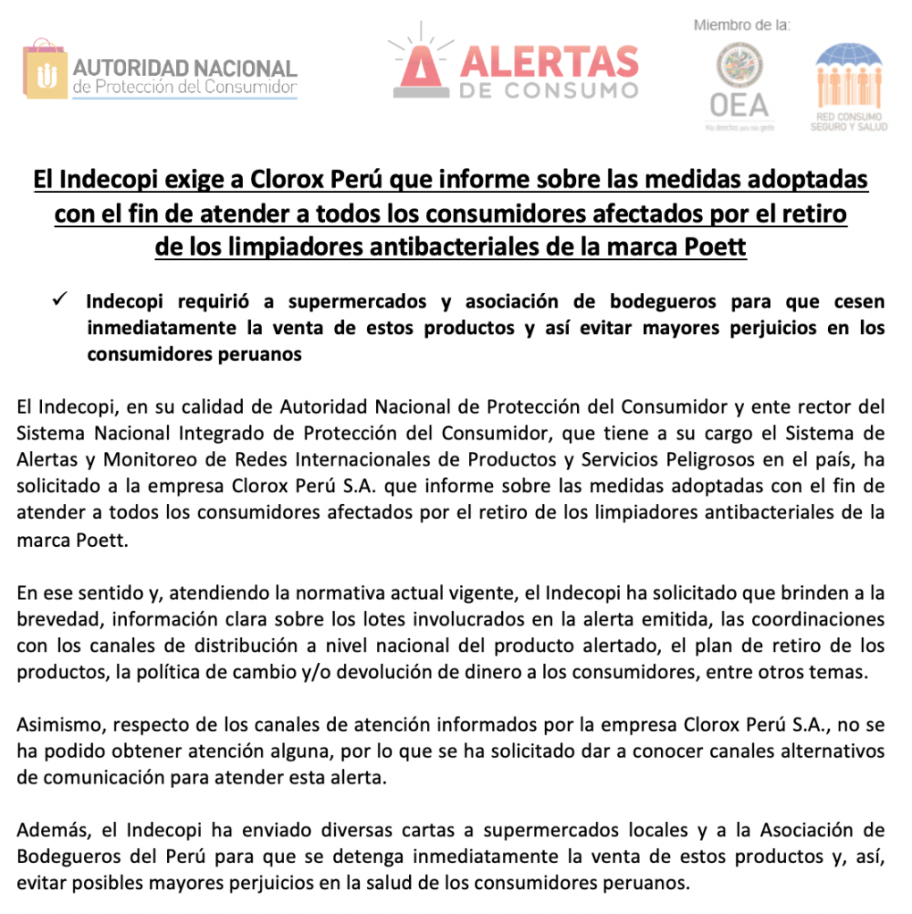 Recordemos que desde el día viernes 10 de julio, en que se dio a conocer la alerta sanitaria, el Indecopi en su calidad de Autoridad Nacional de Protección del Consumidor, realizó una serie de acciones y coordinaciones con entidades competentes, con el fin de evitar que la ciudadanía adquiere dicho producto y que aquellos que ya lo tenían en sus casas, no lo utilizaran ni manipulen, para evitar riesgos a su salud.