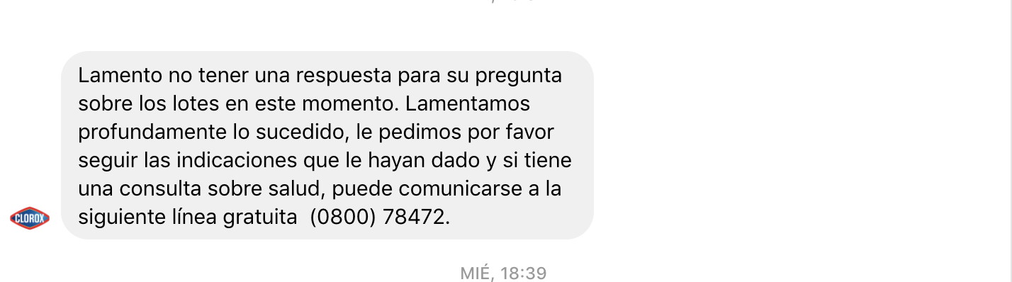 Hace unos días recibí una llamada de Clorox, desde Estados Unidos, con traductor incluido para hablar con el representante de la empresa, quien era una enfermera. A ella le conté el via crucis de la comunicación con la compañía, y la necesidad de tener un descarte, ya que en tiempos de COVID-19 lo último que quiero es incubar una bacteria que luego me complique la vida.