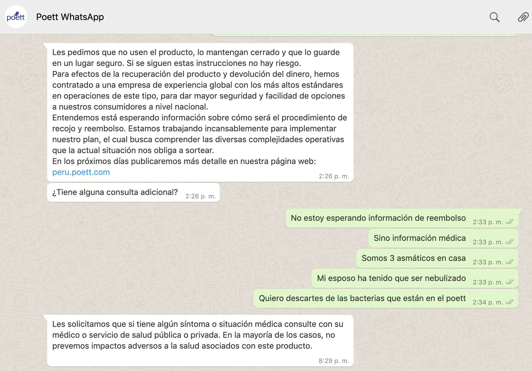 Si han dado una vuelta por las redes sociales, quizás han visto la respuesta del gerente de Poett para el Perú, Rodrigo Alvarado. No se trata tan solo de una disculpa tardía -ayer 22 de julio recién se publicó en sus redes sociales- sino que además continúa enfocándose en la devolución del producto y no en el tema médico.