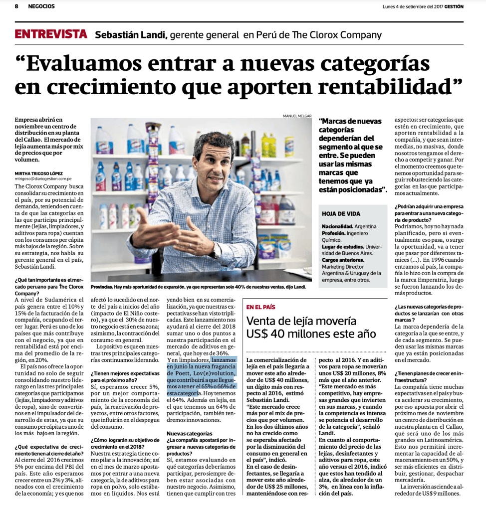 UNO. Poett es parte de las familias peruanas desde hace mucho tiempo. En el diario Gestión, del 07 de septiembre del 2017 el entonces gerente de Clorox Perú, Sebastian Landi, informó que con el lanzamiento que estaban preparando (una nueva fragancia de Poett, Lov(e)volution) se esperaba lograr tener el 65% o 66% del mercado en esta esta categoría. Éramos un cliente importante para la empresa, manejaban una gran proporción del mercado.