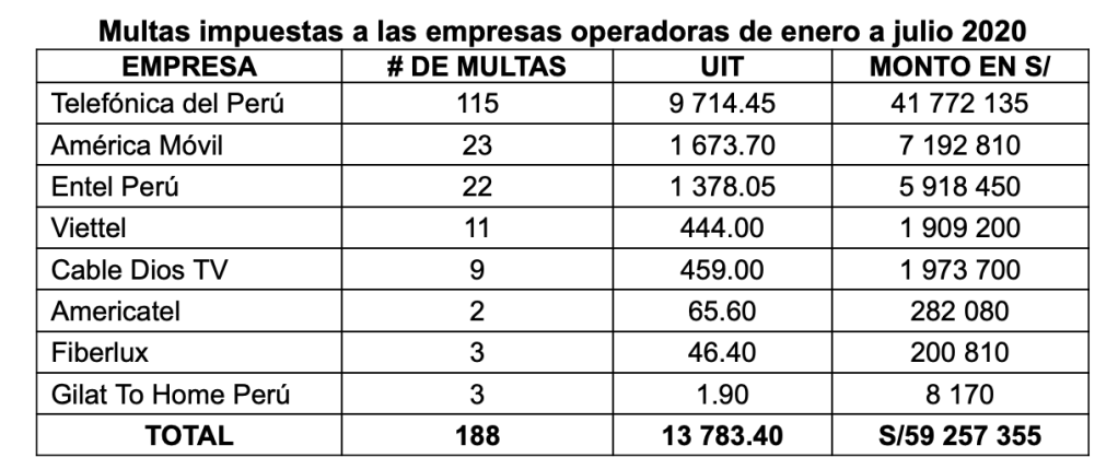 Entre enero y julio de 2020, el Organismo Supervisor de Inversión Privada en Telecomunicaciones (OSIPTEL) impuso multas por un total de S/ 59 257 355 –13 783.40 Unidades Impositivas Tributarias (UIT)– a ocho empresas operadoras, en el marco de los procedimientos administrativos sancionadores de competencia de la Gerencia General (primera instancia administrativa).
