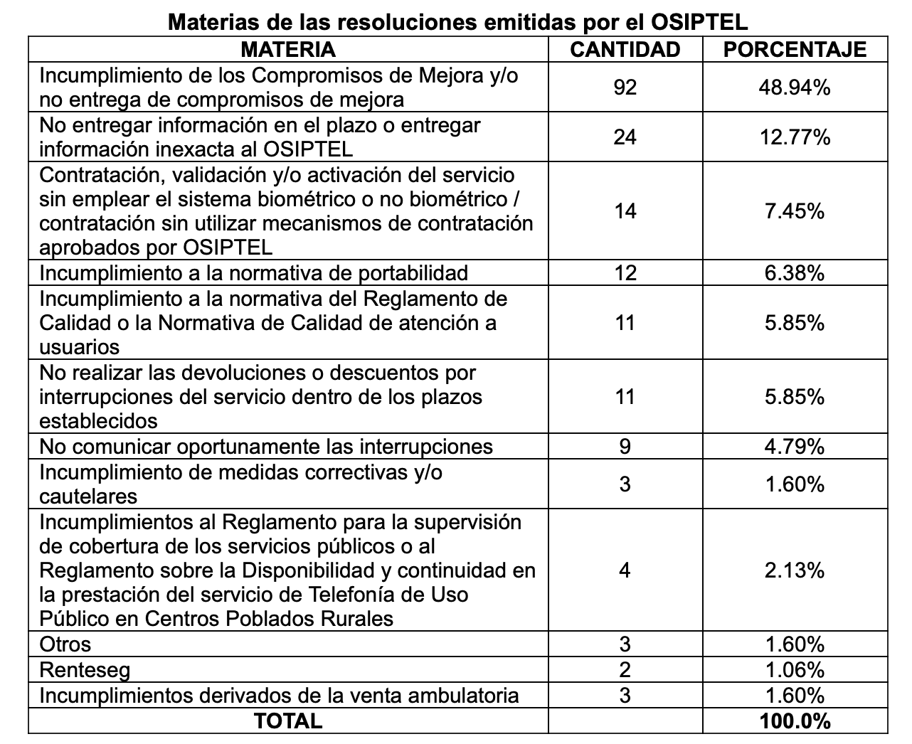De acuerdo con la información del regulador, el 48.94% de los expedientes corresponden a multas por incumplimientos en los compromisos de mejoras de servicio de las empresas operadoras, un 12.77% por no proporcionar información en el plazo establecido o por entregar información inexacta al OSIPTEL, y un 7.45% por no realizar la contratación, validación o activación de un servicio sin emplear el sistema biométrico o los mecanismos de contratación aprobados por el OSIPTEL.