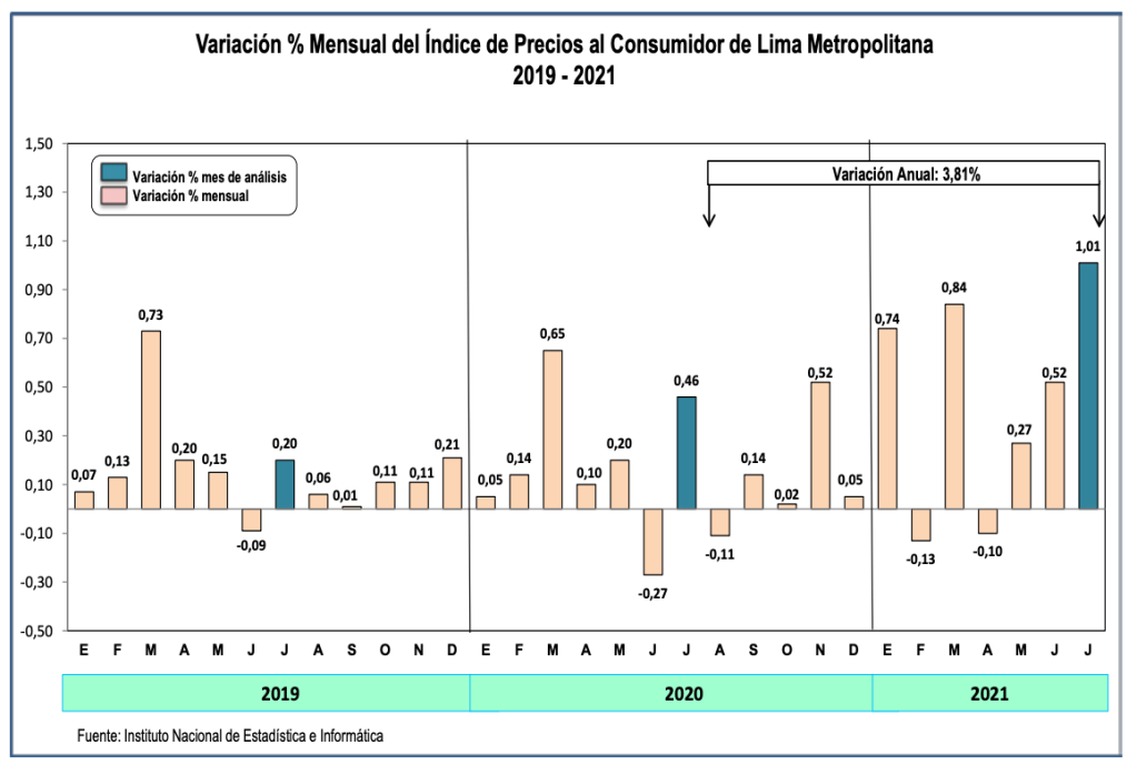 El Instituto Nacional de Estadística e Informática (INEI) dio a conocer que, en el mes de julio de 2021, el Índice de Precios al Consumidor de Lima Metropolitana aumentó en 1,01%, registrando una variación acumulada, al séptimo mes del año, de 3,18% y una variación, de los últimos doce meses (agosto 2020-julio 2021) que alcanzó a 3,81%.