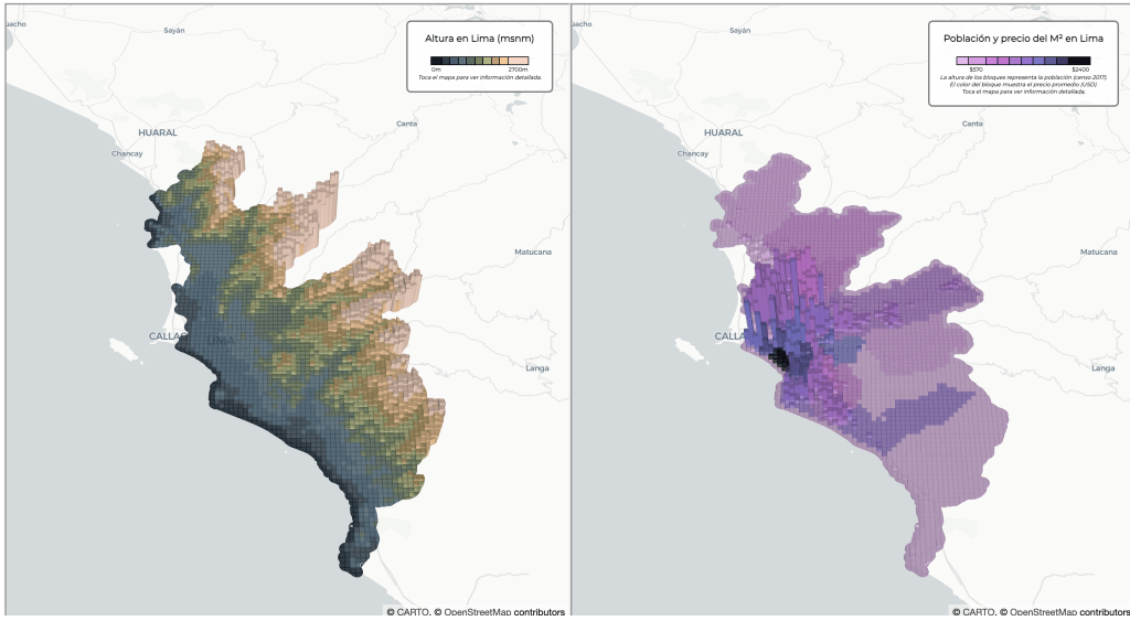 En el mapa que se presenta a continuación se evidencia los resultados del análisis: el primero, un mapa que muestra el territorio de Lima de acuerdo a la altura sobre el nivel del mar; y el segundo, un mapa de Lima que registra la cantidad de habitantes por cuadrante coloreado por el precio de la vivienda.