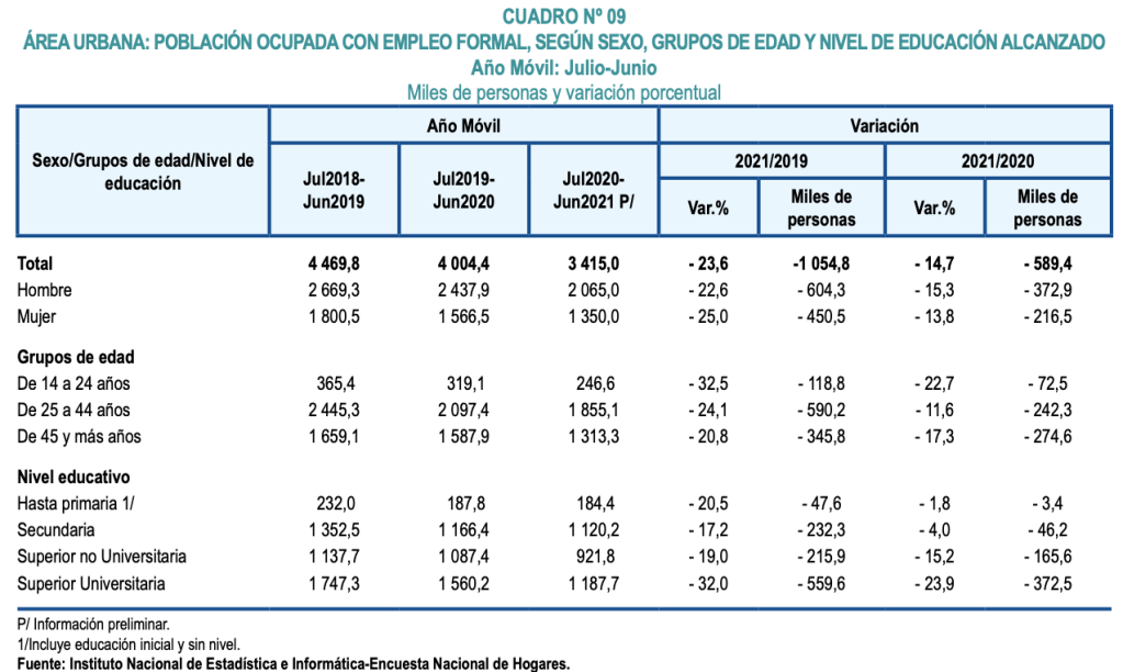 El reporte señala que para el año móvil julio 2020-junio del 2021, el 27,5% de los trabajadores del área urbana tenían empleo formal siendo 5,7 puntos porcentuales menos que en similar año móvil anterior (33,2%). Mientras que, en relación con el año móvil julio 2018-junio 2019 (33,9%), fue menor en 6,4