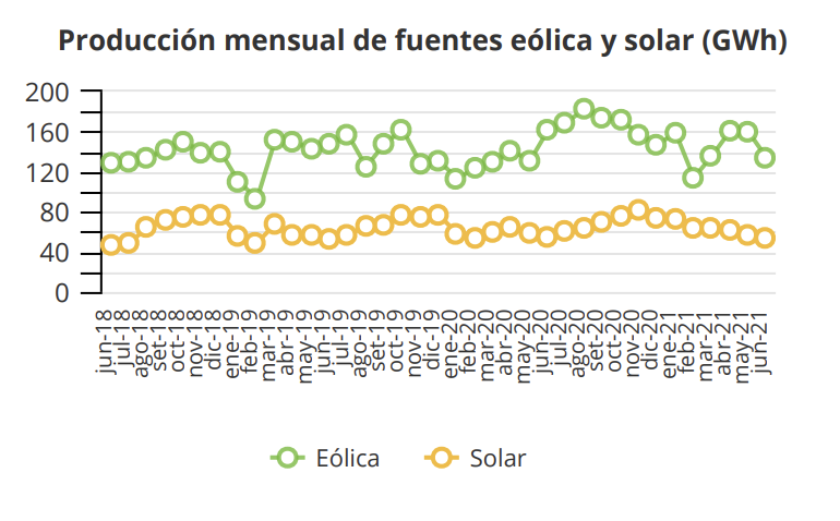 La Sociedad Nacional de Minería, Petróleo y Energía dio cifras sobre energías limpias. Así informó que tras el ingreso de las centrales solares Intipampa y Rubí (la más grande de este tipo en el país) en el 2018, la generación solar mensual promedio se ubicó en alrededor de 60 GWh. De manera similar ocurrió con la entrada de la central Wayra I (la mayor eólica del país) en el 2018, ya que la generación eólica pasó de un promedio mensual de 90 GWh a cerca de 140 GWh en los últimos meses.