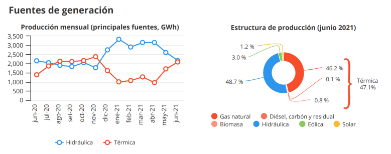 Pero ¿qué ha pasado recientemente con las fuentes de energía tradicional? Las principales fuentes de generación son la hidráulica y la térmica (sustentada principalmente en el gas natural). Ambas representaron en conjunto cerca del 96% de la producción del SEIN en junio del 2021. La generación hidráulica continuó cayendo como consecuencia del inicio del período de estiaje de este año.