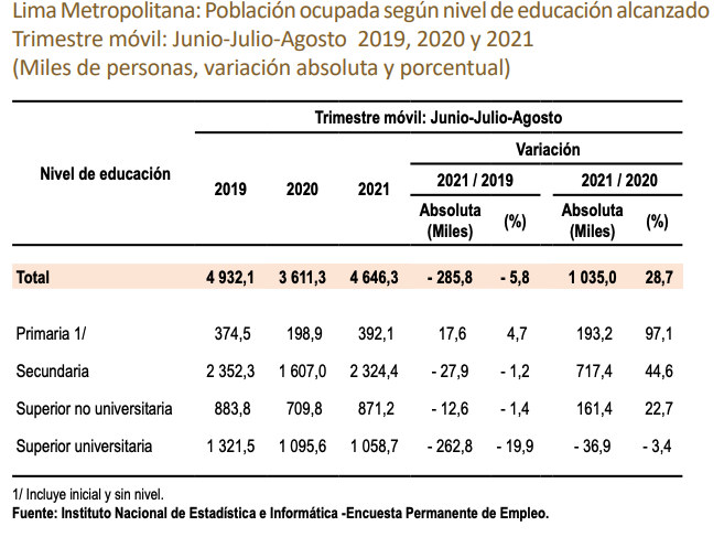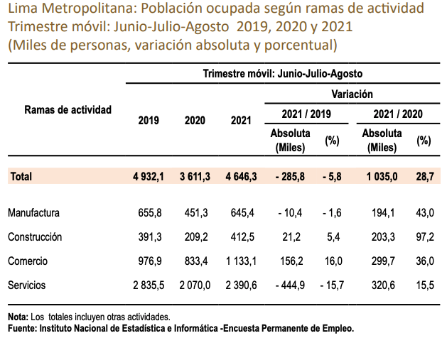 El informe técnico Situación del Mercado Laboral en Lima Metropolitana, elaborado con los resultados de la Encuesta Permanente de Empleo (EPE) del Instituto Nacional de Estadística e Informática (INEI), señala que en el trimestre móvil junio-julio-agosto de este año, la población ocupada de Lima Metropolitana alcanza 4 millones 646 mil 300 personas, aumentando en 28,7% (1 millón 35 mil personas) respecto a similar trimestre del año 2020. Es decir nuestro efecto rebote, pero ¿cuántas personas no consiguen empleo desde momentos pre covid-19? Más de 285 mil personas, es decir el desempleo ha caído 5,8% frente al 2019.