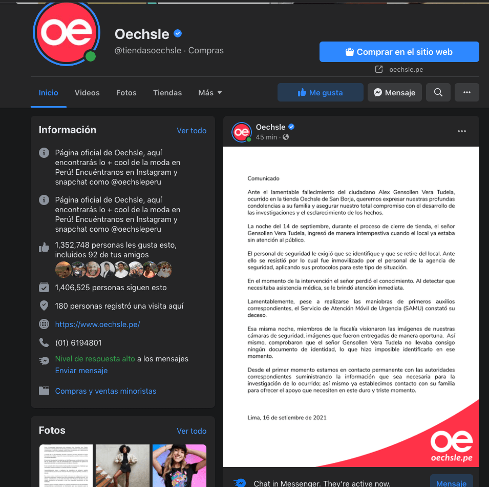 En el ámbito de las redes sociales, el trabajo de prevención ha sido totalmente disparejo. Oechsle solo informa vía Facebook (no cuenta con Twitter) y obvia totalmente Instagram a pesar de tener 279 K seguidores. Respecto a la comunicación vía Facebook (donde tiene más de un millón de seguidores), en 45 minutos había sido compartido más de 98 veces el post, y fue duramente criticado por el tenor del contenido. Las reacciones no se hicieron esperar, las críticas recaen en la entrega de videos no legibles y en los excesos del manejo de la fuerza.