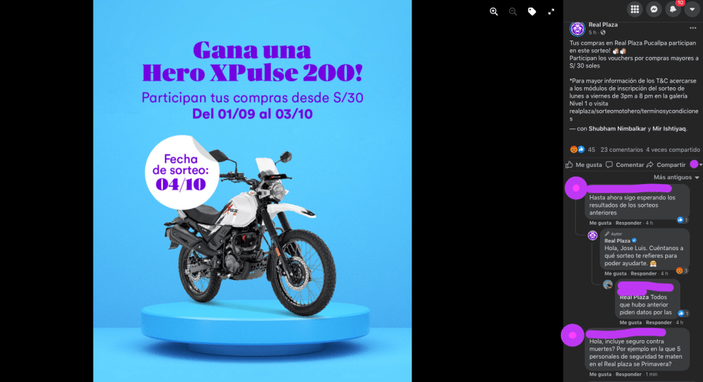 Así se observa en la publicación de un sorteo de una motocicleta (sinceramente ¡qué poca empatía!) que fue posteado el 16 de septiembre. ¡El mismo día de las entrevistas a los deudos en el prime time de la mañana!. En 5 horas el post tenía más comentarios negativos y reacciones en esa dirección, que positivos. Así encontramos que el balance de la campaña de dicho premio es negativa. Ciertamente la posición de mirar de lado los hechos, y considerar el tema como un asunto netamente de Oeschle no les da resultado, menos aún si dos agentes del centro están involucrados.