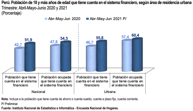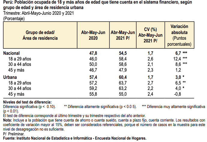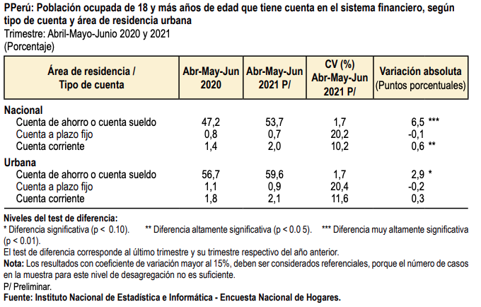 Del total de la población ocupada de 18 a más años de edad el 53,7% tiene cuenta de ahorro o cuenta sueldo, el 2,0% tiene cuenta corriente, y el 0,7% cuenta a plazo fijo. Al compararse con el trimestre similar del año 2020, a nivel nacional, la población que tiene cuenta de ahorro o cuenta sueldo presenta un incremento de 6,5 puntos porcentuales el cual es muy altamente significativo.