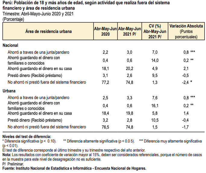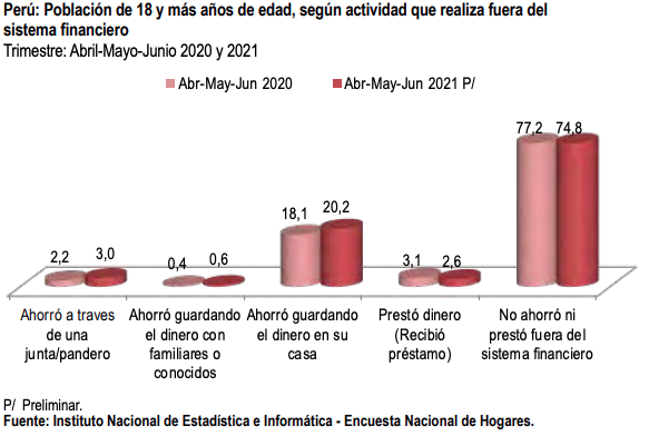 Según los resultados del trimestre abril-mayo-junio del 2021, el 74,8% de la población de 18 años y más de edad no ahorró ni prestó dinero fuera del sistema financiero, esta misma tendencia se observa en el área urbana donde alcanza la misma cifra. Por otro lado, el 20,2% ahorró guardando dinero en su casa; el 3,0% ahorró a través de junta/pandero; y el 2,6% prestó dinero (recibió préstamo).