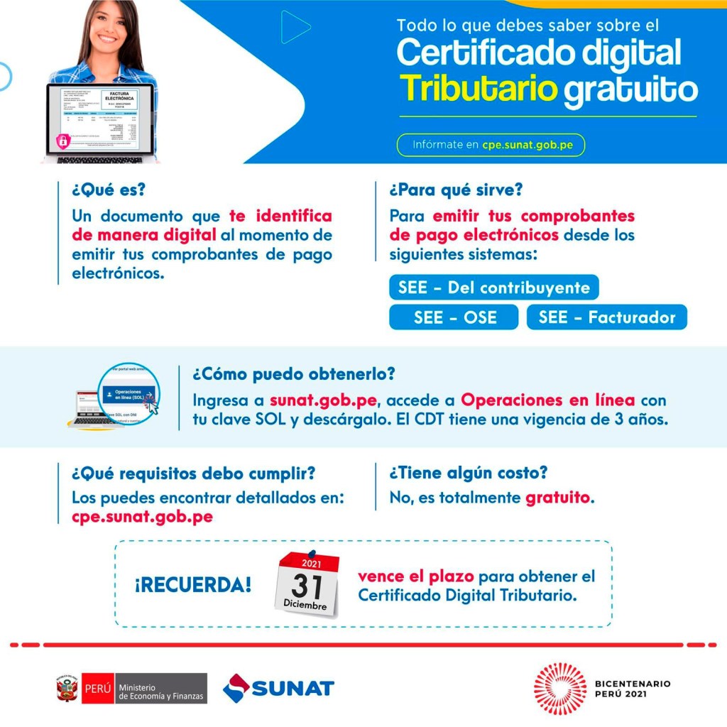 Por esa razón, y con la finalidad de ahorrar costos a las Mypes en su tránsito a la emisión de los CPE, la SUNAT puso a disposición de estas empresas, desde febrero 2020 y de forma gratuita, el Certificado Digital Tributario, con una vigencia de 3 años, precisó Vera Castillo.