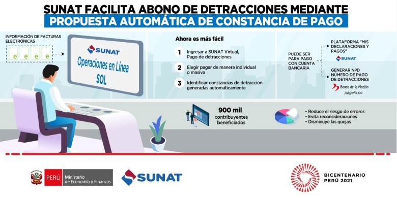 La Superintendencia Nacional de Aduanas y de Administración Tributaria (SUNAT) habilitó la propuesta automática de la constancia de pago de detracciones, por las operaciones gravadas con el IGV, facilitando y simplificando ese proceso, al hacer innecesario que los contribuyentes digiten y calculen los datos.