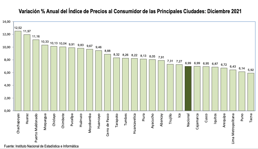 Leyendo el informe del INEI se halla que en diciembre 2021, los precios al consumidor registraron incremento de precios en veinticinco ciudades, presentándose resultados superiores al 1,00% en seis ciudades, en la zona norte destacan Chachapoyas 1,77%, Tumbes 1,66%, Moyobamba 1,53% y Tarapoto 1,31%; además de Huancavelica 1,36% y Huánuco 1,04% situadas en la sierra.