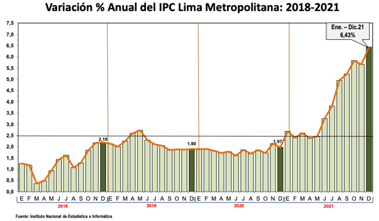 Lima no es el Perú ni debe pretender serlo, pero si se habla de indicadores económicos, muchas veces es la punta de iceberg. Como se esperaba el mes de diciembre no trajo buenas noticias en el Indice de Precios al Consumidor en la capital. No paró su racha alcista, siguió subiendo. Así se registró la inflación más alta en los últimos 13 años, debido al contexto internacional y local, duplicando en el 2021 la franja meta del Ejecutivo peruano, fijada en 3 %, y triplicó el 1,97 % de inflación anual reportada en el 2020. (Si quieres más info sobre la inflación.. te recomendamos escuchar a Javier Zuñiga 👇🏾)