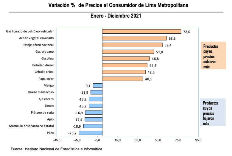 Si se ve solo lo sucedido en diciembre 2021 se encuentra que el Índice de Precios al Consumidor de Lima Metropolitana, correspondiente al mes de diciembre de 2021, observó un aumento de 0,78%, presentando un repunte respecto a los observados en los tres meses anteriores (noviembre 0,36%, octubre 0,58% y setiembre 0,40%). Igualmente, se muestra superior a los registrados en similar mes de los dos años precedentes: 2020 (0,05%) y 2019 (0,21%).