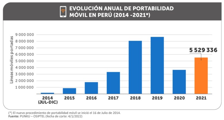 La cifra, que incorpora las 514 051 líneas móviles portadas en diciembre, superó en 51,4 % la portabilidad móvil alcanzada el 2020, año en el que el ritmo de portaciones se debilitó ante las restricciones por la pandemia de COVID-19, registrándose solo 3.6 millones de líneas móviles que cambiaron de operador en ese periodo.