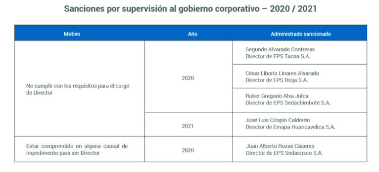 Como parte de las funciones de supervisión, fiscalización y sanción al buen gobierno corporativo de las empresas prestadoras de servicios de saneamiento (EPS), la Superintendencia Nacional de Servicios de Saneamiento (Sunass) removió de sus cargos a cinco directores de empresas prestadoras, al detectar el incumplimiento de requisitos o causales de impedimento para ejercer el cargo, entre los años 2020 y 2021.