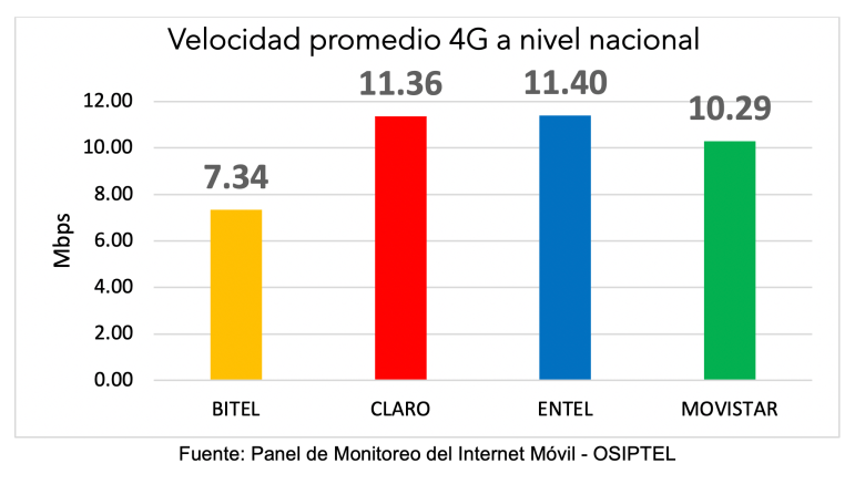 El Panel de Monitoreo de Internet Móvil del OSIPTEL también reportó que el tiempo de cobertura 4G a nivel nacional fue de 87.01% en promedio. Movistar fue el operador con mejor desempeño a nivel nacional, con un tiempo de cobertura de 88.58 %, seguida de Entel (87.09 %) y Claro (86.20 %), mientras que Bitel fue el operador con menor desempeño con 86.01%.