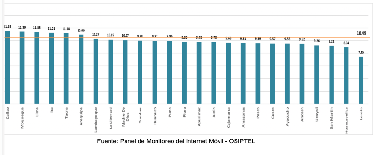En la revisión del desempeño por regiones, solo seis estuvieron por encima del promedio nacional de velocidad y once elevaron sus resultados comparados con lo reportado en diciembre. Además, por primera vez en la medición, una región superó la velocidad de Lima y se ubicó como la segunda con mejor resultado de velocidad nacional. Así, Moquegua (11.39 Mbps) anotó mayor velocidad promedio que Lima (11.35 Mbps), pero por debajo del Callao (11.53 Mbps). En cambio, las regiones con menor desempeño fueron San Martín (9.21 Mbps), Huancavelica (8.94 Mbps) y Loreto (7.45 Mbps).