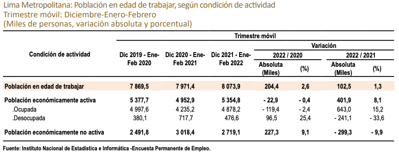 La PEA ocupada del 2020 versus el 2022 durante el trimestre diciembre a febrero se ha contraído en 2.4% y la desocupado creció en 25,4%. Vayamos a los números. 476 600 personas buscan empleo en Lima. Ellas representan el 8,9% de la PEA