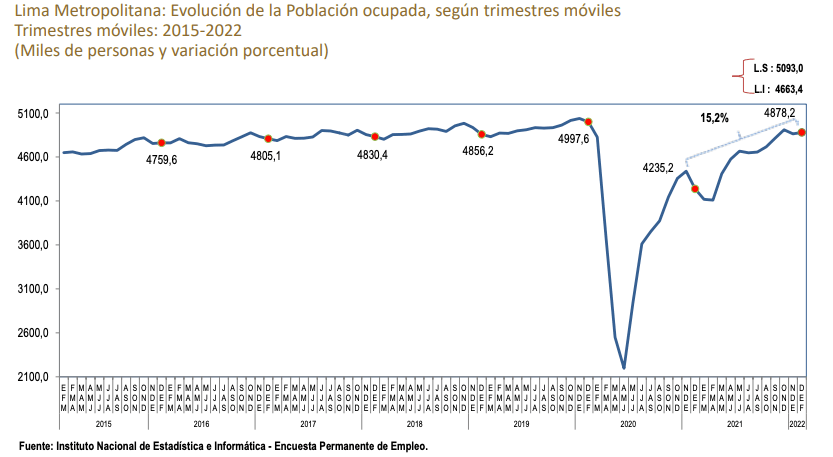 las que buscan estarlo. En el trimestre de análisis la PEA representa el 66,3% (5 millones 354 mil 800 personas) de la población en edad de trabajar. Comparada con similar trimestre del año anterior aumentó en 8,1%, que equivale a 401 mil 900 personas. Sobre la población económicamente activa ocupada, en el trimestre de análisis se estima en Lima Metropolitana 4 millones 878 mil 200 personas con empleo, la cual representa el 91,1% de la PEA. Pero ¿hemos vuelto a niveles pre pandemia? No.
