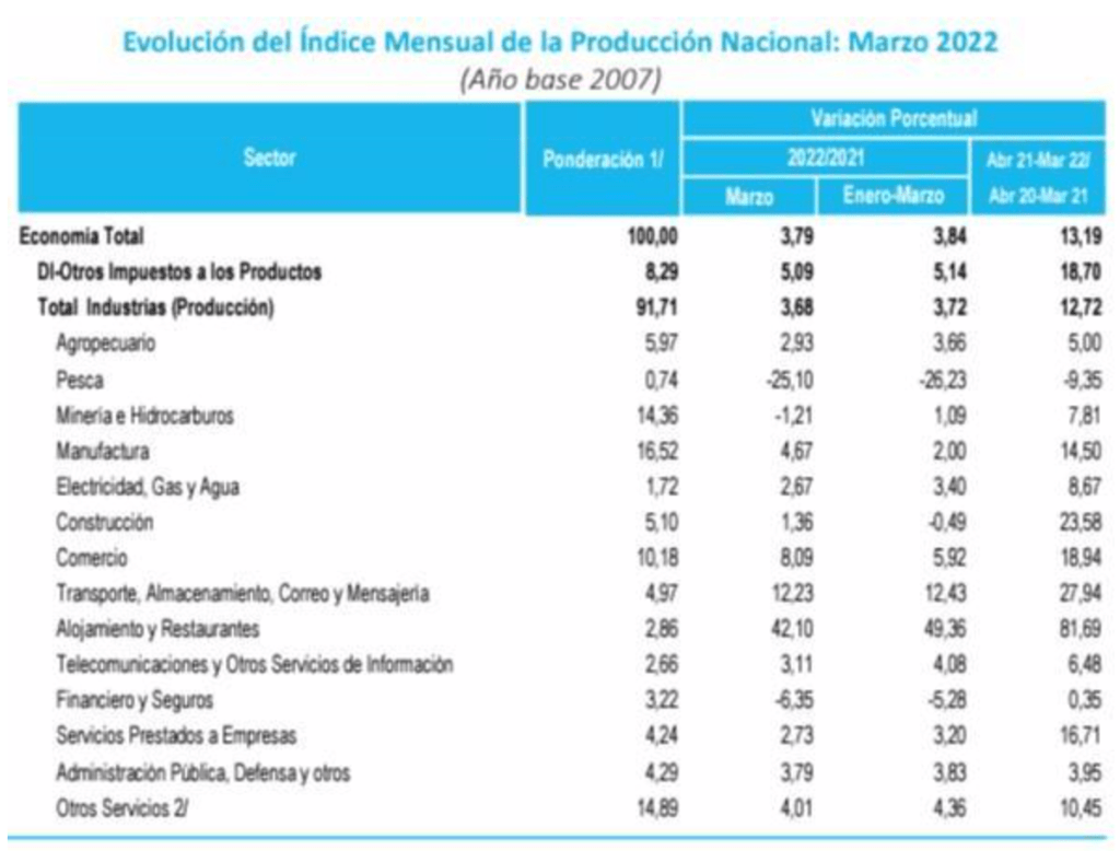De acuerdo con información oficial, la producción nacional creció 3.79% en el tercer mes del 2022 en comparación con marzo del año pasado. El resultado responde al avance en los sectores Comercio, Alojamiento y Restaurantes, Manufactura, Transporte y Almacenamiento, Telecomunicaciones, Agropecuario y Construcción, entre otros. Sin embargo, otras actividades económicas como -la Pesca, Minería y Financiero y Seguros- se contrajeron. Cabe señalar que el referido desempeño tiene como base de comparación marzo de 2021, mes en que las autoridades anunciaron modificaciones al Estado de Emergencia existente, en los niveles de alerta regional y de las restricciones de circulación, con la consecuente afectación de la actividad productiva.