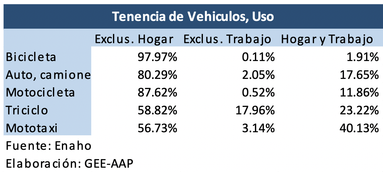 Finalmente, para el gremio, es relevante conocer cuál es el uso que los hogares le dan a los bienes de transporte que tienen en propiedad. En ese sentido, agregó la AAP, durante el 2021, de todas las familias que tienen un auto/camioneta, el 80.29% lo usa exclusivamente para el hogar, el 2.05% lo usa exclusivamente para trabajo, mientras que el 17.65% lo utiliza para ambos. De otro lado, de los hogares que tienen motocicleta, el 87.62% lo usa exclusivamente para el hogar, el 0.52% lo emplea exclusivamente para trabajo y el 11.86% para hogar y trabajo.