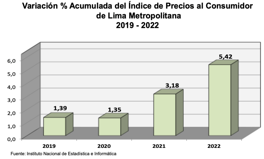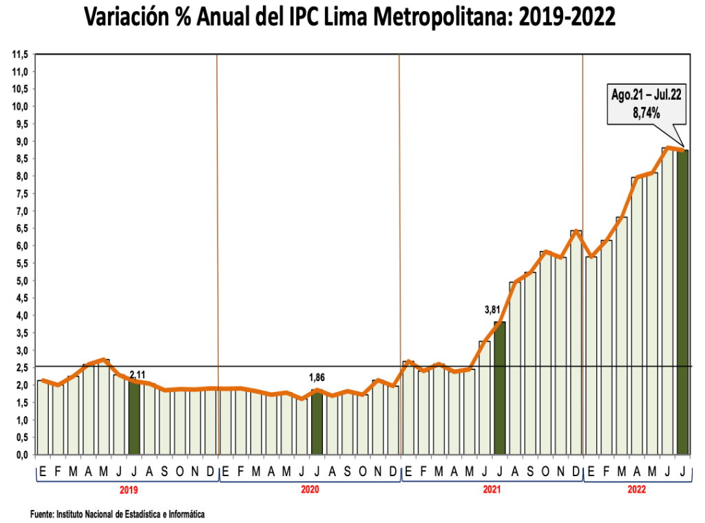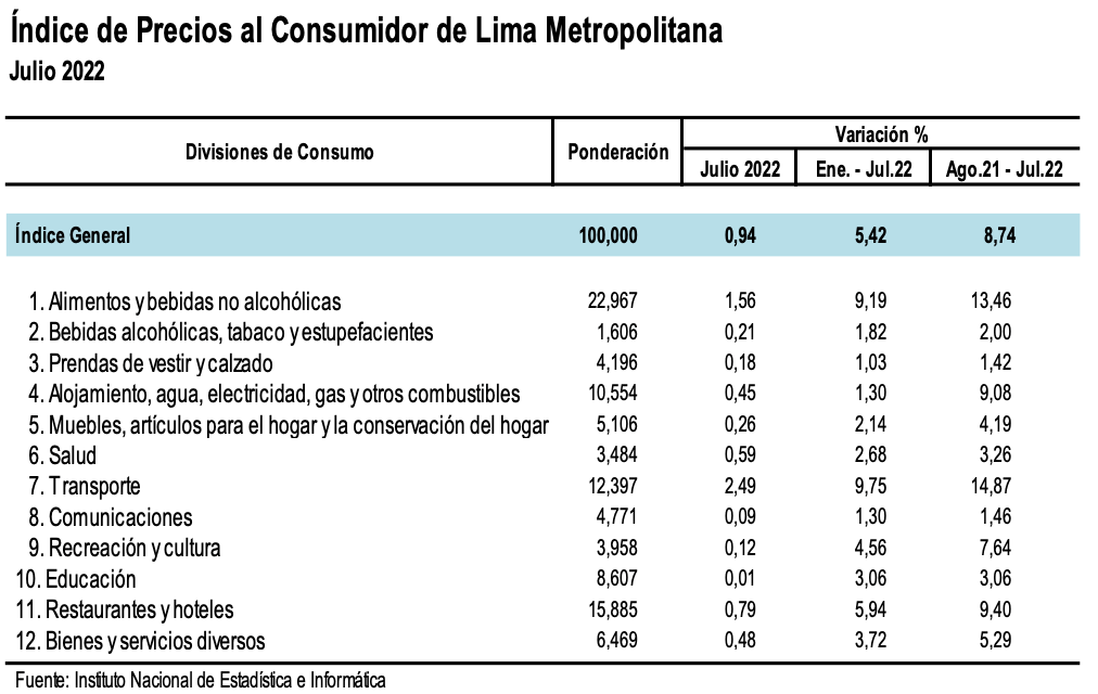 El Instituto Nacional de Estadística e Informática (INEI) informó que, en el mes de julio del presente año, el Índice de Precios al Consumidor de Lima Metropolitana se incrementó en 0,94%, con una variación acumulada de los siete primeros meses de 5,42% y la de los últimos doce meses (agosto 2021 – julio 2022) alcanzó 8,74%.
