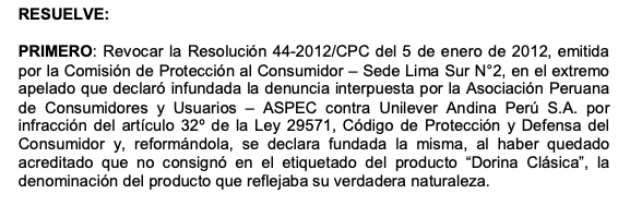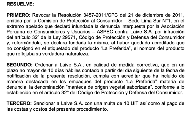 En el año 2010, la Asociación de Usuarios y Consumidores (ASPEC) presentó dos denuncias al respecto. La primera contra Laive y la segunda contra Unilever Andina Perú. El sustento es por infracción del artículo 32° de la Ley 29571, Código de Protección y Defensa del Consumidor. Dos años después y tras apelaciones justificadas, el falló llegó a favor de los consumidores.