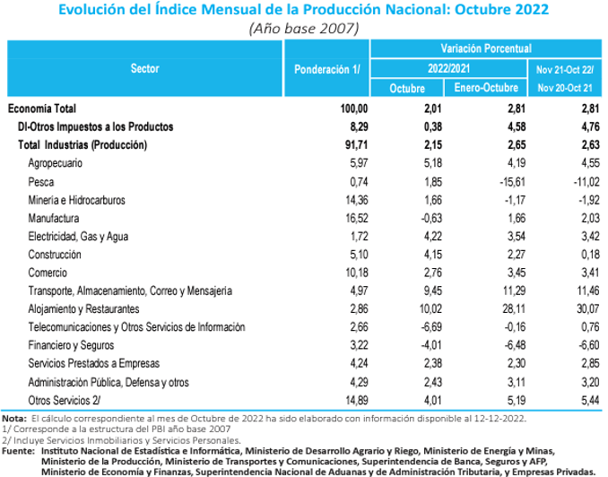 De acuerdo con información obtenida por el Instituto Nacional de Estadística e Informática – INEI, la Asociación Automotriz del Perú (AAP) pudo constatar que la producción nacional registró un nuevo incremento en octubre del presente año; además, el índice de actividad económica nacional anotó una expansión de 2.01% en el décimo mes del 2022 en comparación a octubre del año anterior, en línea con lo esperado por el mercado.
