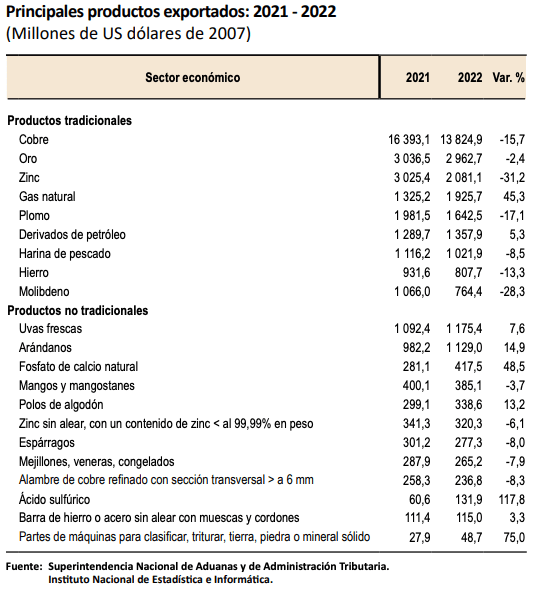 El Instituto Nacional de Estadística e Informática informa que, en el año 2022, el volumen exportado de productos tradicionales disminuyó en 11,3%, determinado por los menores envíos en cobre (-15,7%), oro (-2,4%), zinc (-31,2%), plomo (-17,1%), harina de pescado (-8,5%), hierro