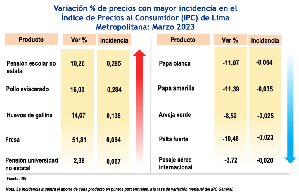 verde inguiri 7,0% entre otros, incrementos que fueron atenuados con las bajas en uva blanca -15,0%, palta fuerte -10,5%, maracuyá -7,9%, granadilla -7,1% y arándanos -5,4%; también aportaron al resultado del mes, leche, queso y huevos principalmente por el incremento de precios en huevos de gallina 14,1%; asimismo, subieron los precios de pescados y mariscos, entre las especies que destacaron están perico 30,2%, jurel 4,3%, trucha 3,3% y bonito 1,4%, en el sentido contrario disminuyeron choros -10,0% y lisa -3,4%; también se registraron aumentos en pan y cereales incidiendo los mayores precios de maíz morado 32,2%, maíz seco cancha 6,6%, trigo morón 2,4%, arroz envasado y galletas saladas con 1,6% cada uno, quinua entera 1,0%, galletas dulces y pasteles salados ambos con 1,0%, fideos secos de pasta larga 0,9% y arroz a granel 0,6%.
