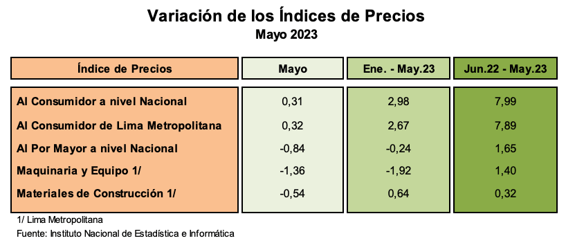 En mayo de 2023, el Índice de Precios al Consumidor a nivel nacional aumentó un 0,31%, acumulando un incremento del 2,98% en los primeros cinco meses del año. Por otro lado, el Índice de Precios al Consumidor de Lima Metropolitana experimentó un aumento del 0,32% en el presente mes, con una variación acumulada del 2,67% en el periodo enero-mayo. La tasa anual, considerando los últimos doce meses, muestra una variación del 7,99% para el indicador nacional y del 7,89% para el de Lima Metropolitana.