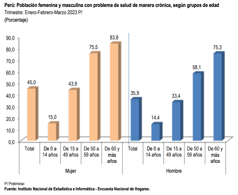 El Instituto Nacional de Estadística e Informática (INEI) ha publicado el Informe Técnico de Estadísticas con Enfoque de Género, basado en los resultados de la Encuesta Nacional de Hogares (ENAHO) realizada de forma continua en todo el país durante las 52 semanas del año. Los datos del primer trimestre del 2023 revelan que el 45,0% de las mujeres entrevistadas experimentaron algún problema de salud crónico, en comparación con el 35,9% de los hombres, lo que significa una diferencia de 9,1 puntos porcentuales.