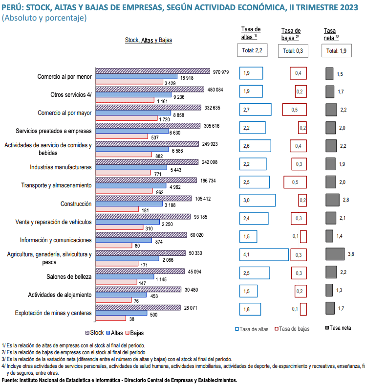 Es esencial entender que la tasa de natalidad empresarial, que representa la relación de empresas creadas o reactivadas en el segundo trimestre de 2023 con el número total de empresas al final del período, ascendió al 2,2%. Al mismo tiempo, la tasa de mortalidad empresarial fue del 0,3%, resultando en una tasa de variación neta del 1,9%. Estos números demuestran un entorno favorable para el emprendimiento en Perú.