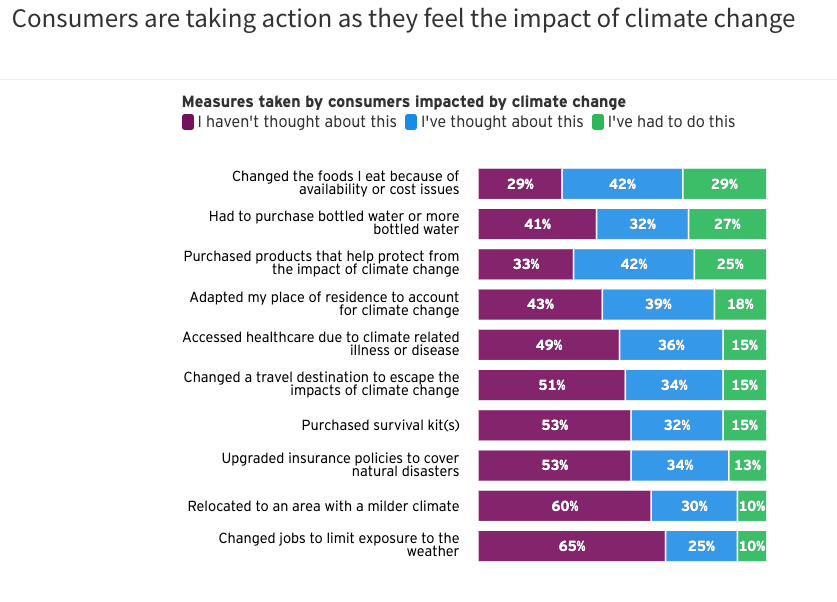 Empresas y minoristas de productos de consumo no pueden pasar por alto estos porcentajes significativos de consumidores que están considerando cambiar sus estilos de vida y hábitos de consumo en respuesta al cambio climático.