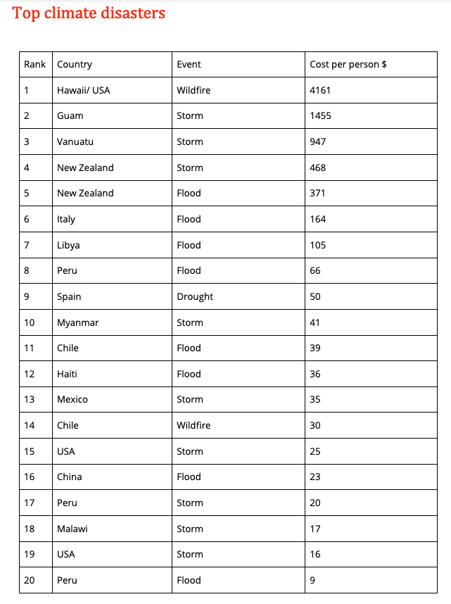 El estudio de Christian Aid resalta que los incendios forestales en Hawái encabezaron la lista, generando un costo per cápita de US$4,161. En Latinoamérica, nos impactaron las intensas lluvias que provocaron inundaciones en las regiones costeras occidentales de Perú, con un costo de casi US$1,500 por habitante.