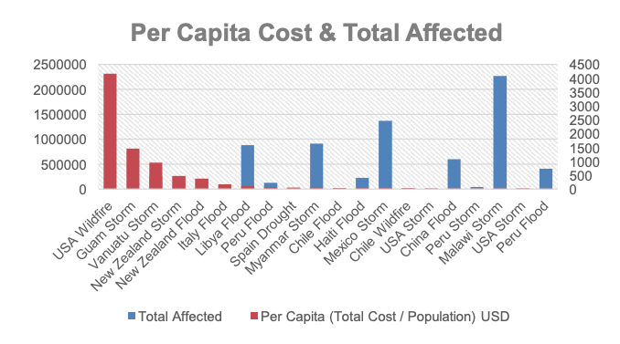 Observamos que, aunque el informe aborda eventos climáticos diversos, hay una consistencia sorprendente entre los desastres que afectaron a más personas y aquellos que generaron los mayores costos per cápita.