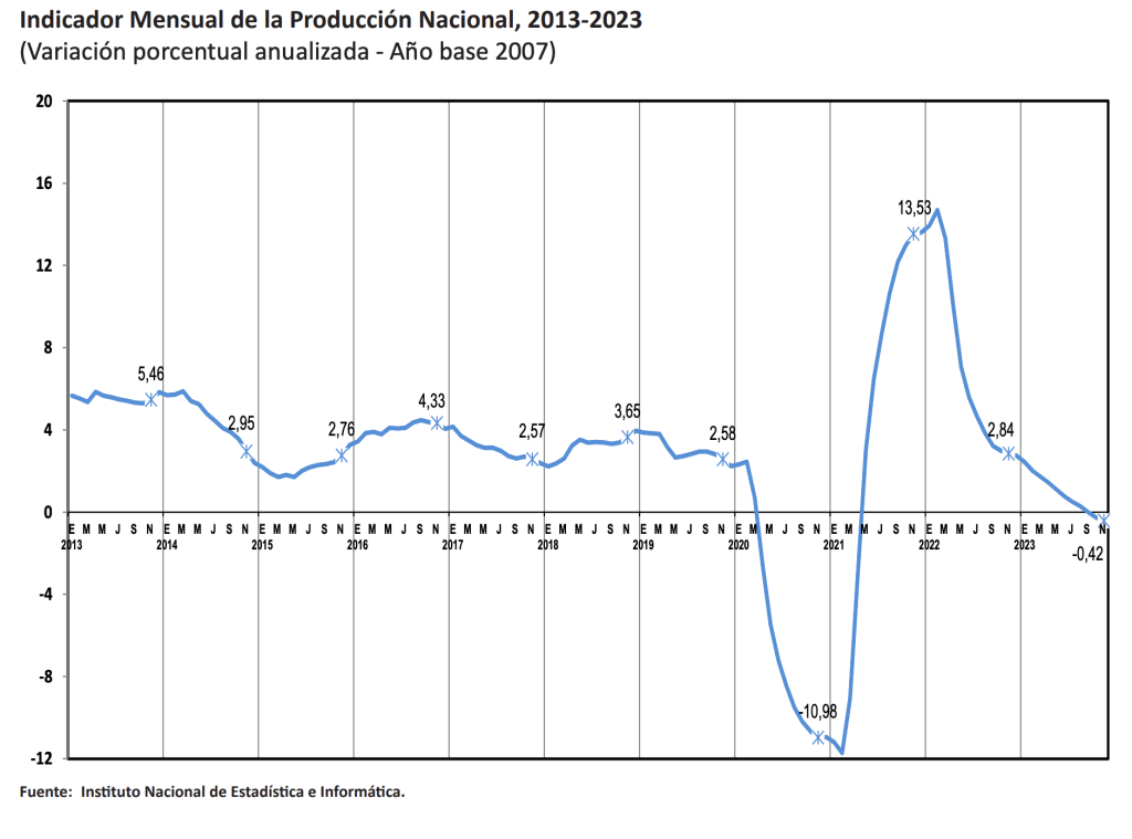 La demanda externa, representada por las exportaciones, ha sido un punto brillante, aumentando en un notable 10.72%. Este incremento se atribuye a mayores envíos de productos tanto tradicionales como no tradicionales. Aunque esta cifra es alentadora, no podemos ignorar que la producción nacional en el periodo enero-noviembre de 2023 ha disminuido en un 0.57%, y en los últimos 12 meses, diciembre 2022-noviembre 2023, se ha registrado una variación negativa del -0.42%.