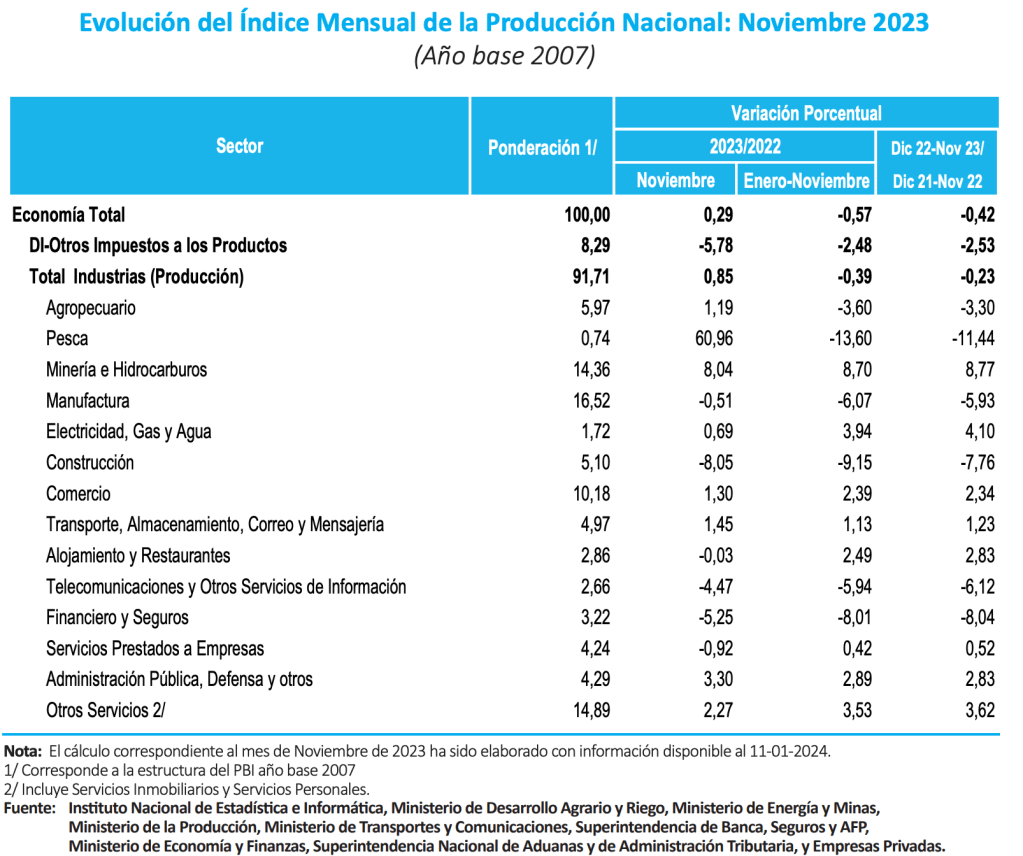 En los primeros 11 meses del año, la economía ha experimentado una caída del 0.57%, según el mismo informe. Profundicemos en los detalles: sectores como Agropecuario, Pesca, Minería e Hidrocarburos, Electricidad, Gas y Agua, Comercio, Transporte, Almacenamiento y Mensajería, Servicios de Gobierno y Otros servicios han mostrado un aumento en la producción. Sin embargo, sectores críticos como Manufactura, Construcción, Alojamiento y Restaurantes, Telecomunicaciones y Otros Servicios de Información, Financiero y Servicios Prestados a Empresas han experimentado disminuciones.
