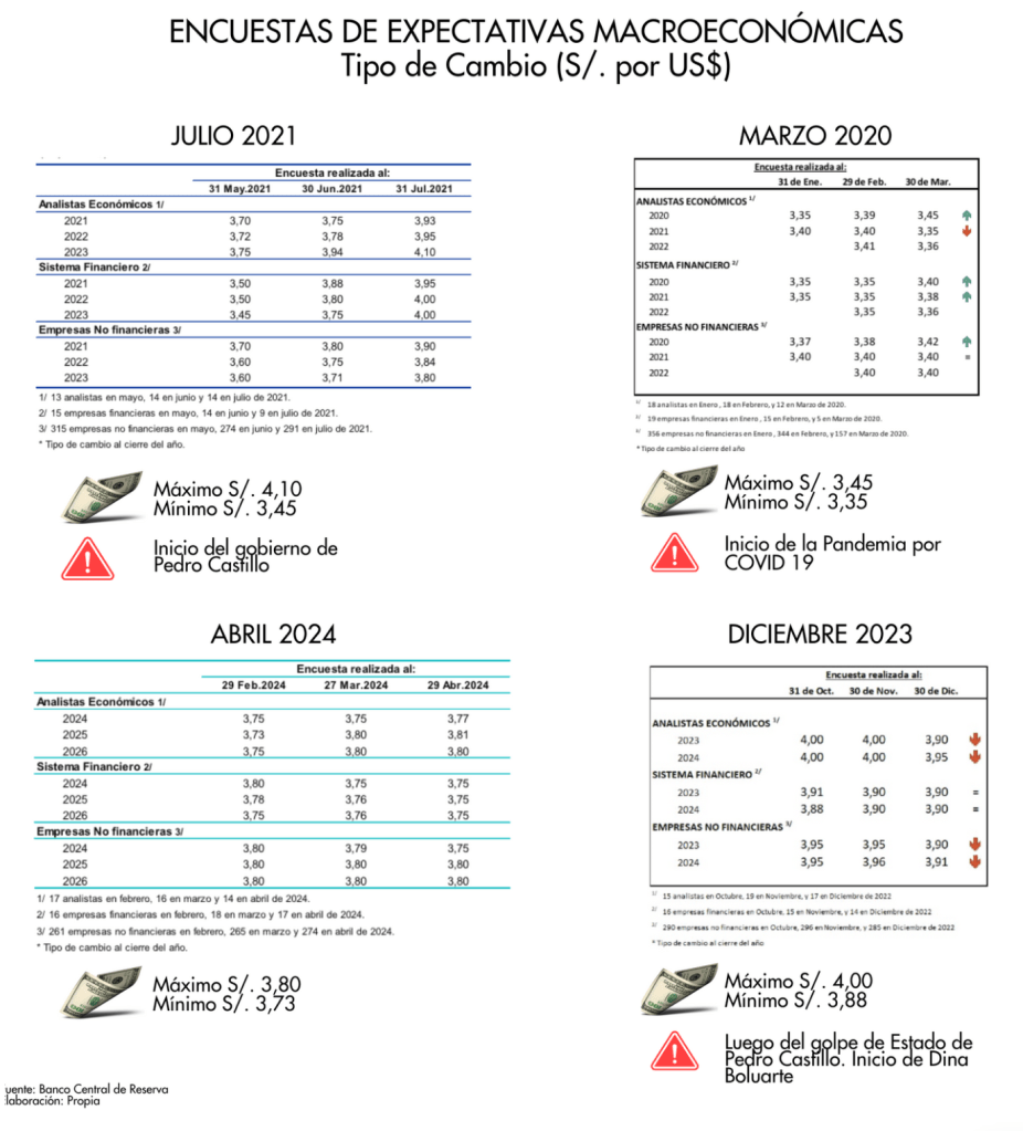 ¿Qué nos depara el futuro? A pesar de los conflictos internacionales latentes en Ucrania y Medio Oriente, el BCRP señaló en su sesión de directorio de mayo que no se espera un impacto substancial en la inflación y por lo tanto el tipo de cambio no se vería afectado en el corto plazo. En el mediano, todo dependerá de los resultados electorales de Estados Unidos.