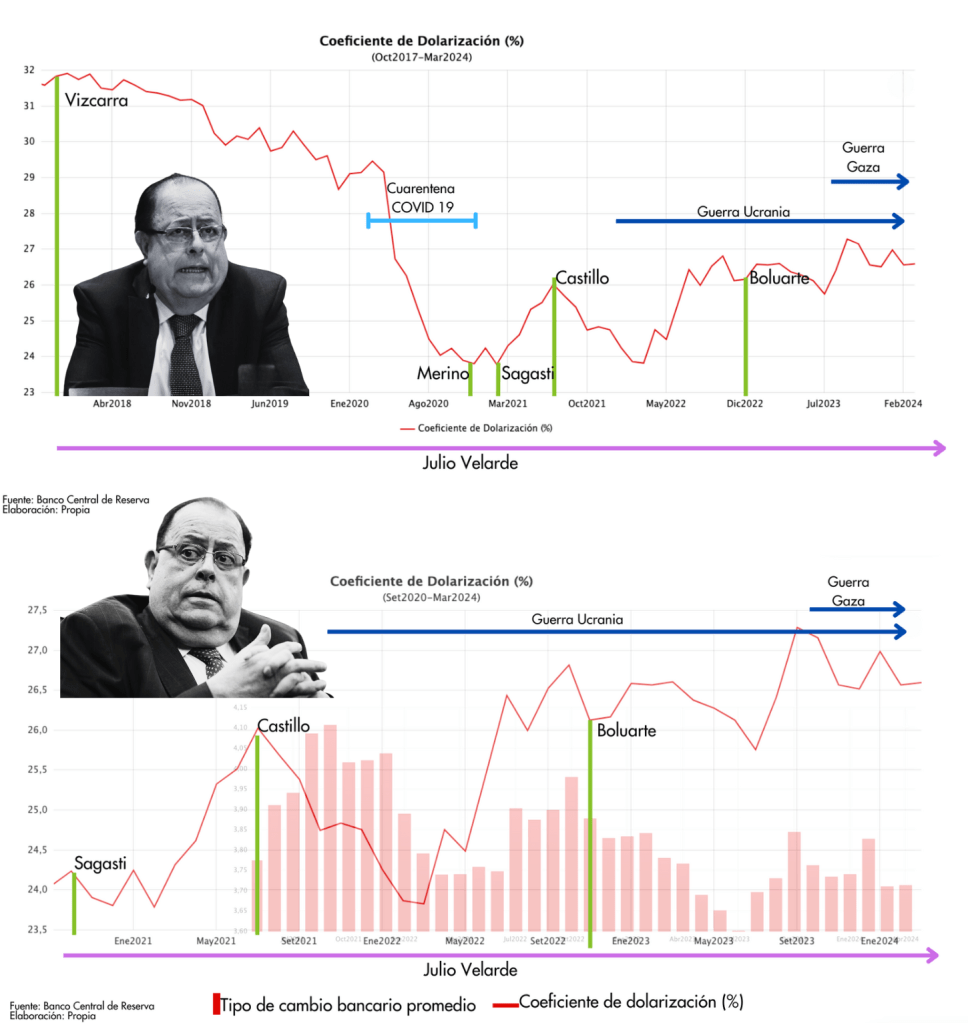Una línea de tiempo nos muestra que los constantes cambios de presidentes en los últimos cinco años empujó a la población a refugiarse otra vez en el dólar. Durante el gobierno de Alan García, que coincide con el inicio del mandato de Julio Velarde como presidente del BCRP, se registró una caída en picada que disminuyó su velocidad y volvió a tener una tendencia al alza con Pedro Castillo y Dina Boluarte.