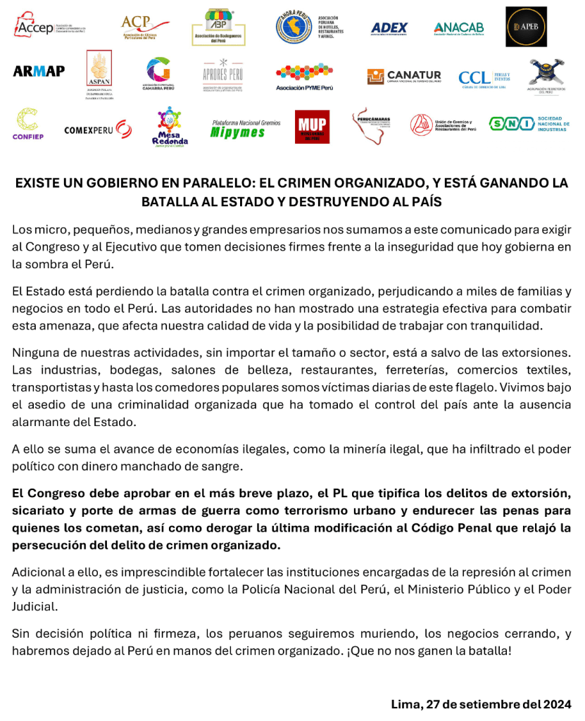 Los gremios empresariales se han pronunciado. Confiep señala que el Congreso debe aprobar en el más breve plazo, el PL que tipifica los delitos de extorsión, sicariato y porte de armas de guerra como terrorismo urbano y endurecer las penas para quienes los cometan, así como derogar la última modificación al Código Penal que relajó la persecución del delito de crimen organizado.