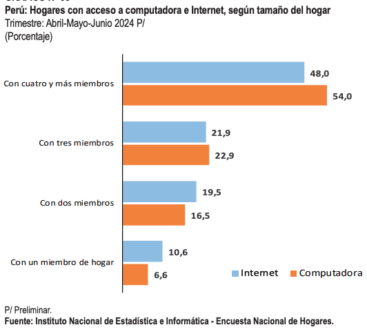 Sin embargo, los hogares con mayor número de miembros acceden más a Internet. El 48,0% de los hogares con cuatro y más miembros y el 21,9% con tres miembros accedieron a Internet en el hogar. En tanto, el acceso es menor en los hogares con dos miembros con el 19,5% y en los hogares unipersonales con el 10,6%. Asimismo, el 54,0% de los hogares con cuatro y más miembros disponen de por lo menos una computadora en el hogar; y el 22,9% de los hogares con tres miembros también disponen de esta tecnología.