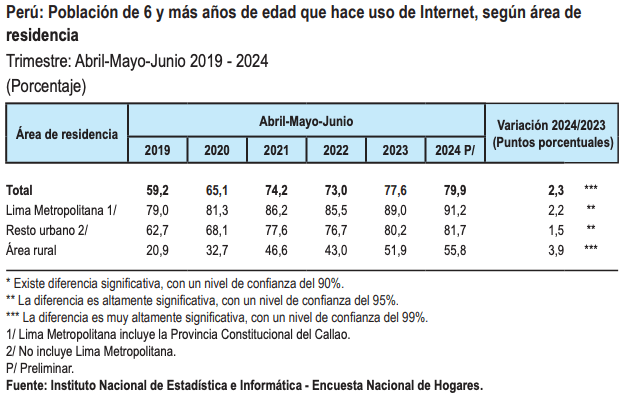 Estos resultados reflejan el avance continuo en la adopción de tecnologías de la información en el país, con una creciente penetración del Internet y el uso de dispositivos móviles, especialmente en zonas rurales.