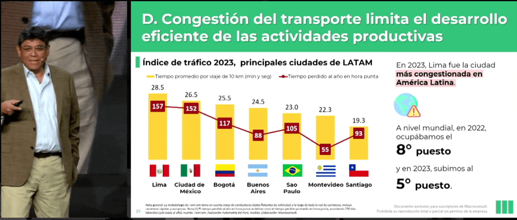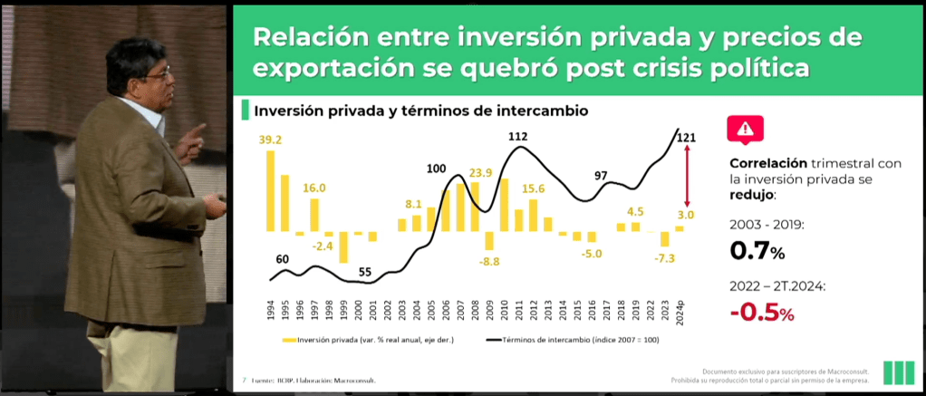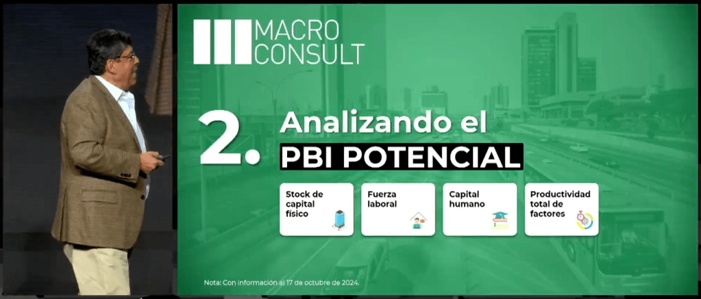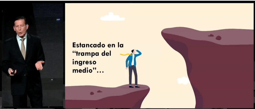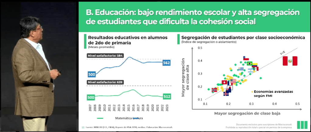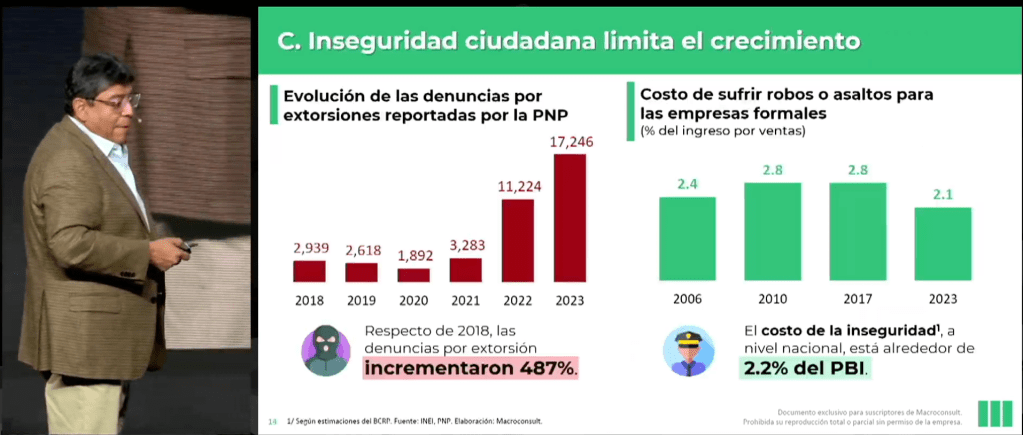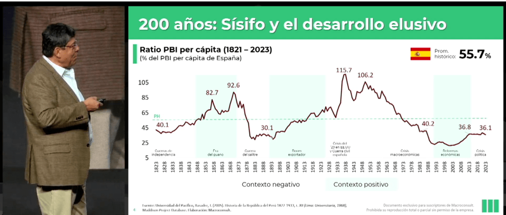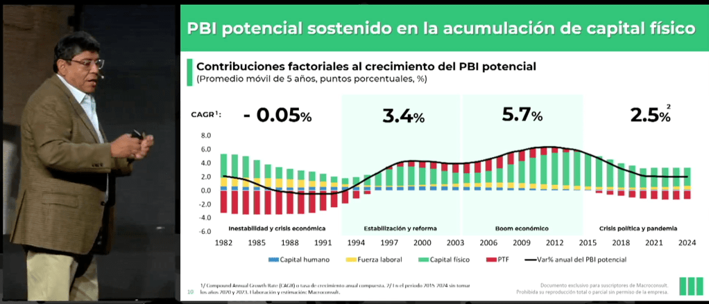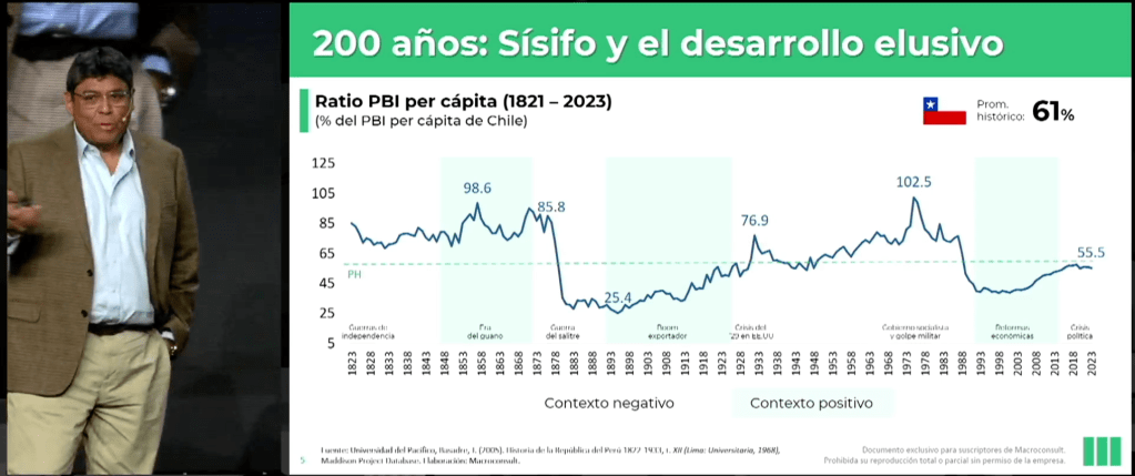 Elmer Cuba, socio de Macroconsult, ofreció un análisis profundo sobre cómo el Perú ha enfrentado históricamente barreras que limitan su crecimiento económico. “Después de 200 años de independencia, nuestra economía sigue siendo solo una quinta parte del PBI de Estados Unidos. Esto no es solo un problema de falta de inversión privada, sino también de un Estado que no evoluciona,” explicó. Cuba señaló que el modelo económico actual no puede sostenerse si no se cierra la brecha entre un sector privado moderno y un aparato estatal desactualizado e ineficiente.